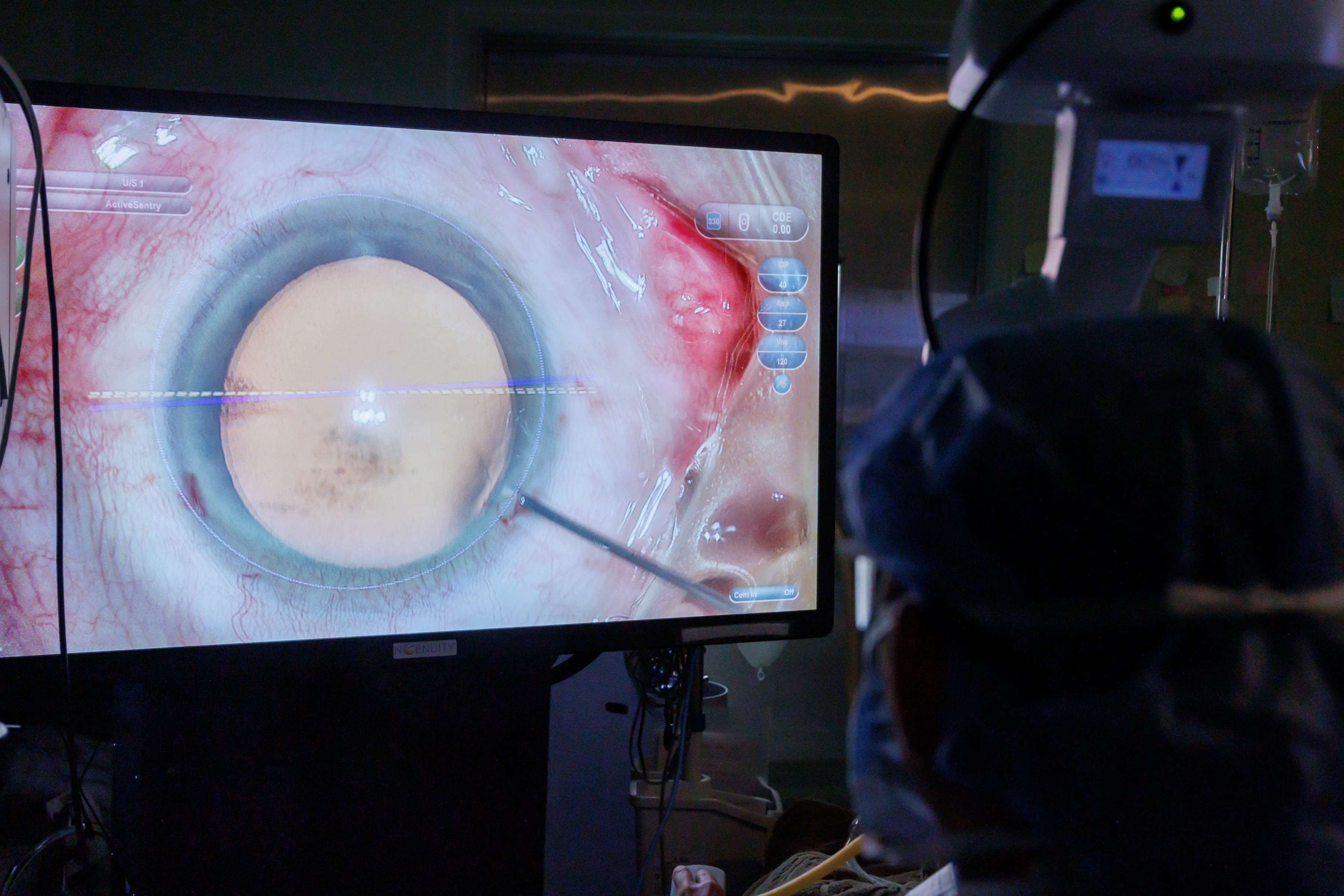 立体視は従来より高精細で、眼内の組織や血管の位置関係をより明瞭に把握できます。これにより切開や眼内レンズ挿入など、精度が求められる場面で判断がしやすくなります。モニター映像はスタッフとも共有でき、手術の進行をチーム全体で確認できます。