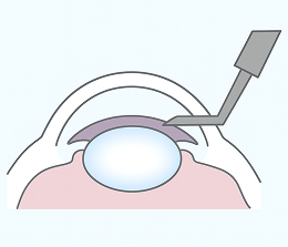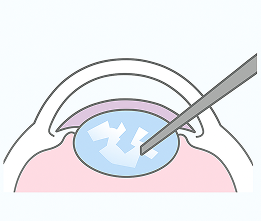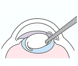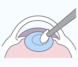 白内障手術は、目をおよそ2mm程度切開し、細い器具を挿入して行います。超音波で濁った水晶体を細かく砕き、吸引して取り除いたあと、人工のレンズ(眼内レンズ)を後囊に移植します。眼内レンズは一度挿入すると、通常は取り替える必要はありません。